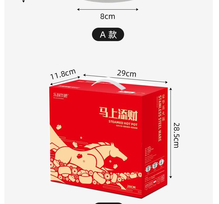 產(chǎn)品規(guī)格:28cm 產(chǎn)品材質(zhì):410不銹鋼 包裝方式:opp透明袋+手提彩盒 彩盒尺寸:31.5cm*17.0cm*27.0cm 創(chuàng)造高業(yè)績,送禮心坎里,好產(chǎn)品,助您開門紅事半功倍。 采用國際標準不銹鋼板材,食品接觸用鋼材,搭配蒸格使用, 冬季火鍋邊煮邊蒸,一鍋兩菜更實用,加高底鍋,可做清湯鍋使用, 可打火鍋使用,多爐灶通用。 紅禮盒包裝,時尚大氣,是您引流拓客,宣傳必備禮品